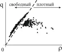 В плотном транспортном потоке, скорость машин меньше, чем минимально возможная скорость машин в свободном потоке. Это означает, что прямая с наклоном равным минимальной скорости в свободном транспортом потоке (штриховая линия на рис. 2) разделяет все эмпирические данные (точки) на плоскости поток-плотность на две области: слева от этой прямой находятся данные, относящиеся к свободному потоку, а справа – данные, относящиеся к плотному потоку.