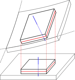 Это смещение можно разложить на векторную сумму смещения срединной поверхности и смещение вне плоскости в направлении . Мы можем записать смещение срединной поверхности в плоскости как