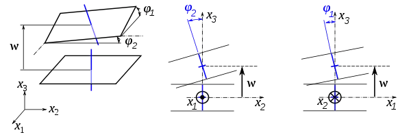 Если — углы поворота нормали к срединной поверхности, то в теории Кирхгофа — Лява