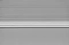 Начиная с конца 1970-х гг, П. Голдрейх, Ф. Шу и другие астрономы применяли теорию волн плотности при исследовании колец Сатурна.[5][6][7] Кольца Сатурна (в особенности кольцо A) содержат большое количество спиральных волн плотности, связанных с резонансами со спутниками Сатурна. Спиральные волны в кольцах Сатурна гораздо более туго закручены по сравнению со спиральными рукавами дисков галактик, что является следствием высокой массы Сатурна по сравнению с массой колец.[7] Миссия «Кассини-Гюйгенс» обнаружила очень малые волны плотности, создаваемые спутниками Паном и Атласом и резонансами более высоких порядков с массивными спутниками Сатурна;[8] также были обнаружены волны, меняющие форму со временем вследствие изменяющихся орбит Януса и Эпиметея.[9]