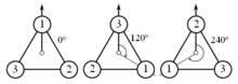 - По аналогии с группой C2 можно построить группу C3, состоящую из поворотов плоскости на углы 0°, 120° и 240°. Можно сказать, что группа C3 является группой поворотов, переводящих правильный треугольник сам в себя.