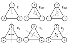 - Если к группе C3 прибавить отражения треугольника относительно трёх его осей симметрии (R1, R2, R3), то мы получим полную группу операций, которая переводит треугольник сам в себя. Эта группа называется D3.