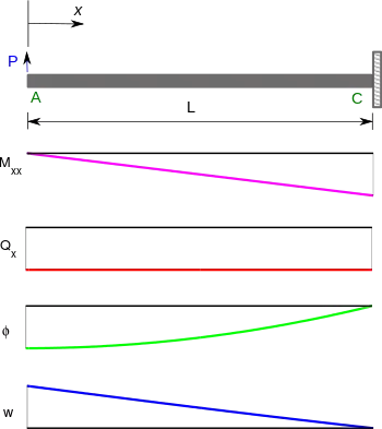 Предположим, что защемленный конец балки имеет координату ,а свободный конец — . Если точечная нагрузка приложена к свободному концу в положительном направлении оси , то условие равновесия системы сходящихся сил балки дает нам