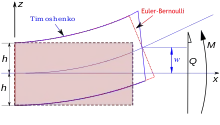 Теория изгиба балок Тимошенко была развита Степаном Прокофьевичем Тимошенко в начале XX века.[1][2] Модель учитывает сдвиговую деформацию и вращательные изгибы, что делает её применимой для описания поведения толстых балок, сэндвич-панелей и высокочастотных колебаний балок, когда длина волны этих колебаний становится сравнимой с толщиной балки. В отличие от модели изгиба балок Эйлера-Бернулли модель Тимошенко приводит к уравнению четвертого порядка, которое также содержит и частные производные второго порядка. Физически учёт механизмов деформации эффективно снижает жёсткость балки и приводит к большему отклонению при статической нагрузке и к предсказанию меньших собственных частот для заданного набора граничных условий. Последнее следствие наиболее заметно для высоких частот, поскольку длина волны колебаний становится короче и расстояние между противоположно направленными сдвиговыми силами уменьшается.