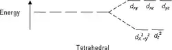 Энергия расщепления для тетраэдрических комплексов Δтетр примерно равна 4/9Δокт (для одинаковых металла и лигандов). В результате этого разность энергетических уровней d-орбиталей обычно ниже энергии спаривания электронов, и тетраэдрические комплексы обычно высокоспиновые.