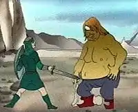 Тепегёз издал рык и вышел из пещеры. От его рыка содрогнулись горы, семь скал семь раз отозвались, камни на склоне горы сдвинулись и покатились. Тепегёз взял в руки палицу и кинулся на юношу. Тот поднял щит, защищаясь от палицы. Тепегёз ударил сверху. Щит раскололся; юноша был ранен, но не упал. Тепегёз выхватил свой меч, парень — свой, начали они биться, не могли одолеть друг друга. Пиками кололись; лбами сшибались; боролись, хватая друг друга за пояс. Пики ломались, земля разверзалась, а они не могли одолеть друг друга. Тепегёз зарядил лук, прицелился, выстрелил, ранил юношу в плечо, пролил его алую кровь, поднял свой меч, кинулся на юношу, хотел срубить ему голову, но юноша вывернулся, отскочил, зацепился арканом за ветку большого дерева, сам ухватился за другой конец, раскачался, перепрыгнул на ту сторону реки. Когда Тепегёз повернул голову и хотел посмотреть на него своим единственным глазом, юноша снова перепрыгнул на верёвке на этот берег. Так он мотался на верёвке туда-сюда, а Тепегёз своим единственным глазом не мог уследить за ним. Но вот юноша подпрыгнул очень высоко и, в воздухе прицелившись, послал стрелу прямо Тепегёзу в глаз[12].