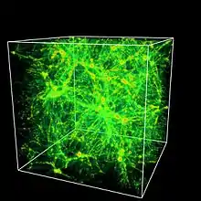 Большая часть из того, что нам известно о подобной среде, получена при компьютерном моделировании эволюции Вселенной[4]. Считается, что WHIM образует волокнистую структуру из разреженных высокоионизованных барионов с концентрацией 1−10 частиц в кубическом метре пространства.[5]. В данной среде образуются ударные волны в газе, вследствие активности ядер галактик, а также при слияниях и аккреции. Часть гравитационной энергии, высвобождающейся в таких процессах, преобразуется в тепловое излучение вещества при ударном разогреве[1].