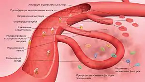 Ангиогенез включает в себя продление уже сформированных сосудов и представляет собой процесс прорастания новых капилляров, включающий активацию эндотелиальных клеток, деградацию межклеточного матрикса, пролиферацию и миграцию эндотелиоцитов и образование первичных высокопроницаемых сосудистых структур. В последующем происходит стабилизация и «взросление» первичных сосудистых структур за счет привлечения клеток другого типа: перицитов и гладкомышечных клеток, в результате чего происходит организация сложной трехмерной сосудистой сети[8].