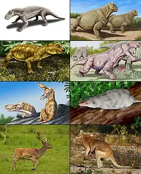 ![]() Разнообразие терапсид. 1-й ряд: биармозух, мосхопс вида Moschops capensis; 2-й ряд: Myosaurus, иностранцевия вида Inostrancevia alexandri; 3-й ряд: Pristerognathus, Adelobasileus; 4-й ряд: лань, прыткий валлаби. | |||||||||||||||||||||||||||||||||||||||||