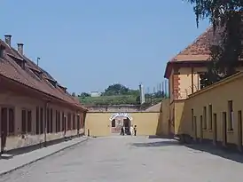 ![]() Ворота в здании крепости с надписью «Труд освобождает» (нем. Arbeit macht frei) | |