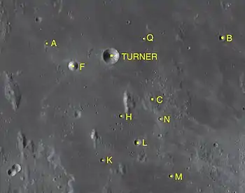 - Сателлитный кратер Тернер F относится к числу кратеров, в которых зарегистрированы температурные аномалии во время затмений.