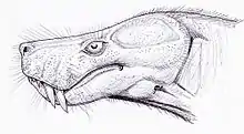 - Собственно тероцефалы (Therocephalia) — примерно 5 семейств, из которых наиболее многочисленны пристерогнатиды[2] (Pristerognathidae). Сюда же относят (или даже объединяют с пристерогнатидами) сцилакозаврид (Scylacosauridae) и ликозухид[3] (Lycosuchidae). Это очень примитивные хищные тероцефалы, во многом сходные по образу жизни с горгонопсами. Многие виды (Trochosuchus, Lycosuchus, Porosteognathus) имели две пары функционирующих верхних «клыков», сильно развитые резцы и слабые послеклыковые зубы. Впрочем, наличие двух пар клыков подвергается в настоящее время сомнению — не исключено, что за дополнительный функционирующий клык принимали замещающий клык, обычно скрытый в толще верхнечелюстной кости. Собственно пристерогнаты (Pristerognathus) обладали длинной низкой мордой и очень развитыми клыками. Длина самых крупных видов достигала 2 метров. Известны из средней — поздней «перми» Южной Африки и Восточной Европы. Найденные в России сцилакозух (Scylacosuchus) и поростеогнат (Porosteognathus) очень сходны с южноафриканскими родами.