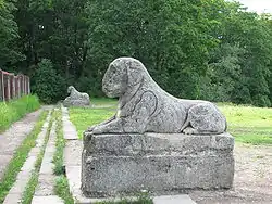 Во время Великой Отечественной войны была разбита балюстрада террасы, скульптуры львов сильно повреждены. Статуи «Архитектура» и «Живопись» были сброшены с пьедесталов, а «Скульптура» и «Поэзия» — пропали. Их нашли только в 1971 году на дне Белого озера. Там же были найдены несколько ваз и части балюстрады[4][2].