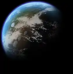 Другой метод заключается в использовании аммиака в качестве мощного парникового газа. Существует вероятность, что большое его количество существует в замороженном виде на карликовых планетах, которые движутся по собственным орбитам в отдалённых областях Солнечной системы. Возможно, будет найден способ транспортировать эти планетоиды и ввести их в атмосферу Марса[22]. Поскольку аммиак (NH3) по массе состоит в основном из азота, он сможет также обеспечить наличие буферного газа в атмосфере. Поддерживаемые, не слишком разрушительные падения космических тел на Марс поспособствуют повышению температуры и массы атмосферы.