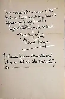 - Письмо на трёх страницах. Минни объясняет своему корреспонденту происхождение рукописных комментариев, которые он обнаружил на полях печатного текста пьесы. Она сообщала, что тётя Эллен Терри не сама написала эти комментарии, как можно было предположить, а заставила это сделать Чарльза Терри. Также упоминается, что Эллен Терри дала самой Минни копию этой пьесы, надеясь, что она сыграет её в Австралии, но девушка этого не сделала[17].
