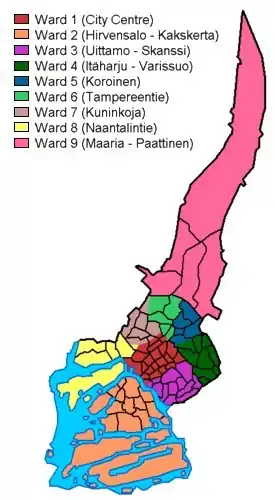 Территориальное деление Турку — город разделён на 9 округов, в которые входят 45 более мелких единиц, состоящих из одной или более территориальных единиц. Всего их 134.[1].