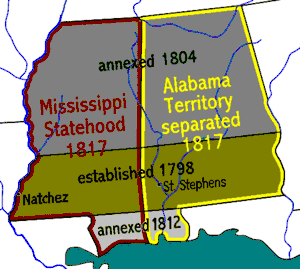 3 марта 1817 года территория Миссисипи была поделена на две: Миссисипи (западная) и Алабама, с временной столицей в Сент-Стивенсе (восточная)[1]. Граница между ними прошла по прямой линии, так что территория Миссисипи оказалась поделена на две примерно равные части. 10 декабря того же года Миссисипи стал двадцатым штатом США.