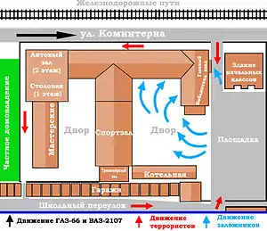 Однако у СОШ № 1, как у объекта захвата, существовал и ряд отрицательных сторон: школа находилась на расстоянии приблизительно 80 метров от здания УВД, а форма двора и близлежащие здания ограничивали видимость для державших оборону. Наконец, само расположение здания школы в центре Беслана создавало дополнительный риск провала диверсионной группы во время приближения к объекту. Учитывая также тот факт, что другие бесланские школы по совокупности факторов были не менее уязвимы для нападения[68], доподлинная причина, по которой террористы выбрали СОШ № 1, неизвестна или не обнародована следствием.