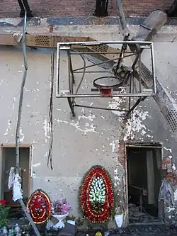 ![]() Сверху слева по часовой стрелке: полуразрушенное здание школы № 1 в 2008 году; православный крест в спортзале в память о погибших; «Древо скорби» на мемориальном кладбище Беслана; фотографии погибших заложников | |