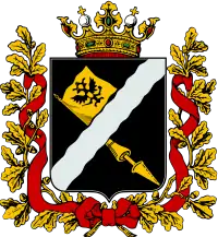 Герб Терской области Российской империи, утверждён 15 марта 1873 г. — «В чёрном щите серебряная волнообразная перевязь влево, за которой Императорский штандарт на золотом древке. Щит увенчан древней царской короной и окружён золотыми дубовыми листьями, соединёнными Александровской лентою».