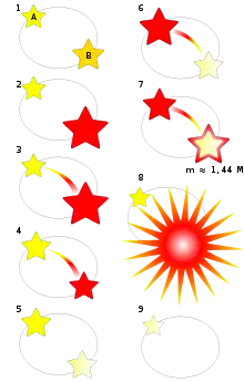 Эволюция тесных двойных систем зависит от первоначальных масс компонентов и расстояния между ними. На иллюстрации в качестве примера приведён ход эволюции системы, в которой вспыхнет сверхновая типа Ia. Можно выделить несколько этапов: