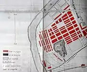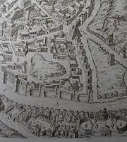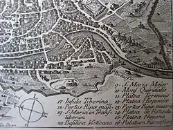 | На одном из самых ранних изображений Тестаччо представлен бесформенным курганом[24]. Piero del Massaio. 1472 год. | Alessandro Strozzi. 1474 год. | На рисунке 1561 года холм изображён одиноко стоящим посреди пустоши в стенах античного города. Pirro Ligorio. | Джузеппе Вази. 1763 год. |