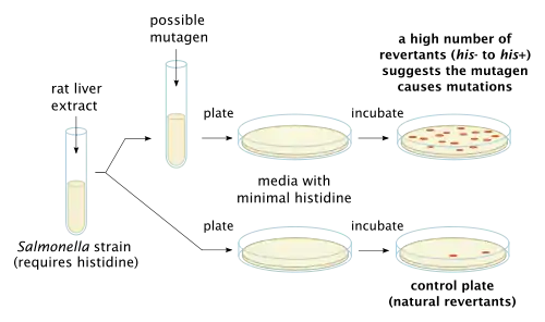 В тесте используются некоторые штаммы бактерии Salmonella typhimurium, которые несут мутации в генах, участвующих в синтезе гистидина (то есть это ауксотрофные мутанты, требующие искусственного внесения гистидина для роста). В тесте изучается возможность предполагаемого мутагена вызывать ревертивную мутацию данного гена, при которой штамм приобретает способность расти на среде, не содержащей гистидин. Предназначенные для тестирования штаммы подобраны таким образом, чтобы содержали обе рамки считывания и точечные мутации в генах ответственных за синтез гистидина, что позволяет обнаруживать мутагены путём воздействия на различные механизмы. Некоторые химические соединения крайне специфичны и поэтому вызывают реверсии только в одном или двух штаммах [3]. Используемые в тесте штаммы также несут мутации в генах, ответственных за синтез липополисахарида, делая клеточные стенки бактерий более проницаемыми,[4]. Кроме того, отсутствие некоторых генов, ответственных за репарационные процессы, делает тест более чувствительным [5]. Ввиду коренных отличий между метаболизмом бактерий и млекопитающих в тесте может быть использована вытяжка из печени крыс для имитации эффекта обмена веществ, так как некоторые соединения, например бенз [а]пирены, не обладают мутагенной активностью, но их производные, которые образуются в процессе метаболизма, приобретают генотоксичность [6].