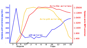Первыми выявляемыми антителами являются «gag» (англ. group antigen ) белки ВИЧ — р24 и р17, а также прекурсор р55. Образование антител анти-р24 сочетается со снижением уровней свободного антигена р24, выявляемого в крови до появления антител[9][10]. Вслед за антителами анти-р24 появляются антитела против белков «Env» (англ. Envelope) — gp160, gp120, p88, gp41 и гена «pol» (англ. Polymerase) — p31, p51, p66. Могут определяться также и антитела против генов «vpr», «vpu», «vif», «rev», «tat», «nef»[11][12].