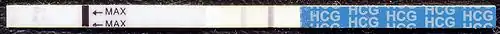 Самый популярный тест — стрип-полоска, на которой беременность обозначается двумя полосками, её отсутствие — одной. На бесцветную вторую полоску теста нанесены специфические антитела к ХГЧ. Если в момент проведения теста в моче женщины его концентрация достаточно велика, место с нанесёнными антителами окрашивается и проявляется вторая полоска[3].