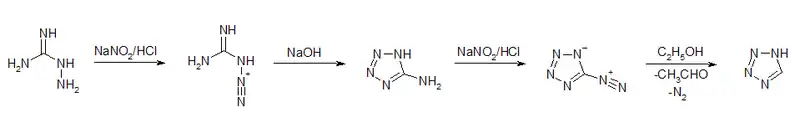 Препаративный метод синтеза тетразола — дезаминирование 5-аминотетразола, получаемого нитрозированием аминогуанидина с дальнейшей циклизацией образовавшегося азида, действием азотистой кислоты в спиртовом растворе[2][3]: