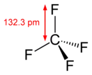 Из 4 фторпроизводных метана, — фторметана, дифторметана, трифторметана и тетрафторметана, связь между атомами фтора и углерода в тетрафторметане является самой прочной. Это обусловлено высокой электроотрицательностью атомов фтора, оттягивающих электронное облако от атома углерода на себя, в результате чего атом углерода оказывается заряжен положительно: +0,76 элементарного заряда и это усиливает кулоновские силы между положительно заряженным атомом углерода и отрицательно заряженными атомами фтора.