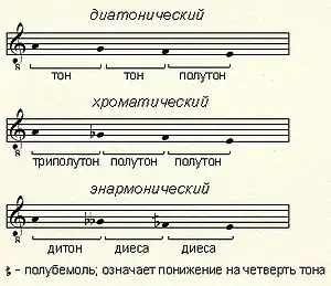 В классической нотации основные (родовые) разновидности тетрахордов можно условно представить так: