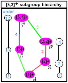 T, 332, [3,3]+, или 23 порядка 12 – хиральная или вращательная тетраэдральная симметрия. Имеется три ортогональных 2-кратных осей вращения, наподобие хиральной диэдральной симметрии D2 или 222, а также четыре дополнительных 3-кратных оси. Эта группа изоморфна A4, знакопеременной группе 4 элементов. Фактически это группа чётных перестановок четырёх 3-кратных осей: e, (123), (132), (124), (142), (134), (143), (234), (243), (12)(34), (13)(24), (14)(23).