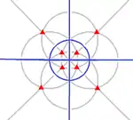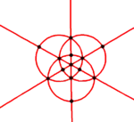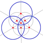 В стереографической проекции рёбра тетракисгексаэдра образуют 6 окружностей (или центральных радиальных прямых) на плоскости. Каждая из этих окружностей представляет зеркало в тетраэдральной симметрии. Пересечение этих окружностей дают точки вращения порядка 2 и 3.