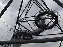 На нижнюю смотровую площадку, расположенную на высоте 18 м, ведёт прямая пологая лестница. На вторую площадку (высота — 32 м) ведёт крутая прямая лестница. На третью, самую верхнюю, площадку (высота — 38 м) ведёт винтовая лестница. Общая длина лестниц до верхней смотровой площадки насчитывает 387 ступеней. Верхняя площадка установлена под углом 8° к горизонтальной плоскости. Лестницы и смотровые площадки крепятся с помощью стальных канатов, что вызывает их колебания при сильном ветре. Пол смотровых площадок выполнен в виде решётчатого настила.
