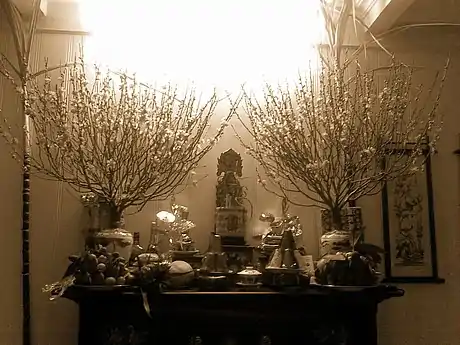 В каждом доме на севере находится персик (hoa đào, хоа-дао), в центральных и южных районах — хоа-май (Ochna integerrima), в горных селениях — хоа-бан (hoa ban). На севере (ранее — в богатых домах) также иногда выставляют Prunus mume, также называемое по-вьетнамски «май»[26]. В северных и центральных районах на Новый год в жилых комнатах встречаются деревья кумквата[27][28]. Его многочисленные цветы символизируют пожелание богатства.