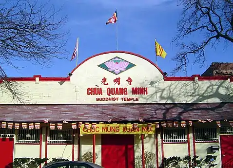 Храм Тюакуангминь в Чикаго, на котором вывешен плакат с надписью «Счастливой новой весны» (Chúc mừng xuân mới, тюк мынг суан мой)