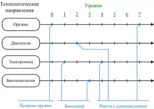 - Heinimäk, 2012: «Technology tree, also known as techtree or tech-tree, is a traditional name for a progression graph defining or depicting the relations and dependencies between technologies».