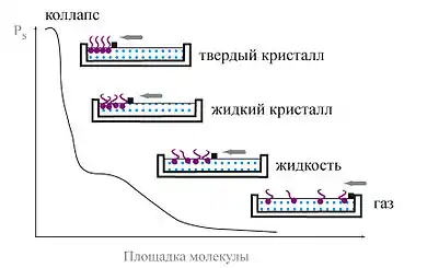 При последовательном изотермическом сжатии изменяется структура мономолекулярной плёнки, которая проходит через ряд двумерных состояний, условно именуемых состояниями «газа», «жидкости», «жидкого кристалла» и «твёрдого кристалла» (см. рис. 2). Каждое из этих состояний характеризуется определённым поверхностным давлением — аналогом поверхностного натяжения. Чем выше поверхностная концентрация молекул на поверхности, тем выше поверхностное давление. При некотором критическом поверхностном давлении устойчивость мономолекулярного слоя нарушается и он превращается в полимолекулярную плёнку.