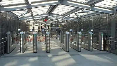 В центре станции есть пешеходный мост для перехода между платформами, который также связан с северным вестибюлем переходом, идущим над путями линии.