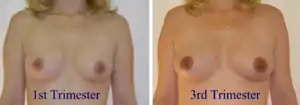 В результате увеличения выработки меланина (которое в свою очередь вызывается увеличением количества эстрогенов[9][10]) возможно потемнение сосков и кожи вокруг них, на животе появляется тёмная срединная линия, так называемая, Linea nigra. Гиперпигментация проходит после родов[11].