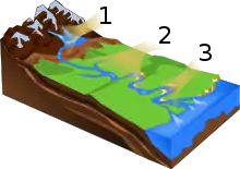 Верхнее течение образовывается в вершинах гор при скоплении воды из-за подземных вод и осадков, и оттуда река берёт своё начало.