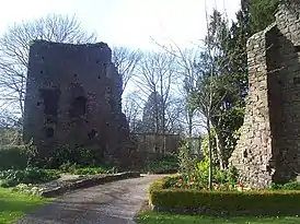 ![]() Слева: руины Солнечной башни, Тивертонский замок, построена Хью де Куртене, 9-й граф Девон (1276—1340). Вид с юго-востока | |