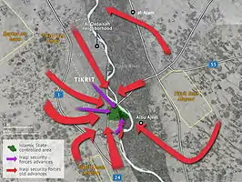 В начале марта 2015 года правительственные войска Ирака, в коалиции с иранскими отрядами и авиацией США, Великобритании и Франции, начали операцию по освобождению города. 31 марта правительство Ирака заявило, что вернуло контроль над городом.[18].