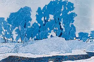 В известной картине «Русская зима. Иней»[53][54][55][56] (1969) старые тополя под пушистыми снеговыми шапками в голубоватом инее на берегу Мсты переданы Тимковым как воплощение красоты и величия русской природы. В ней, пожалуй, впервые столь отчетливо и убедительно проявилось новое качество в живописи художника — монументальность образного решения, возникшее после поездки годом ранее на Урал.[57]