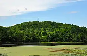 На вершине расположена высокая обзорная башня.