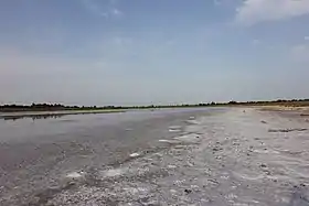 Берег Тинаки покрыт белым налетом, состоящим из кристаллов рапы.