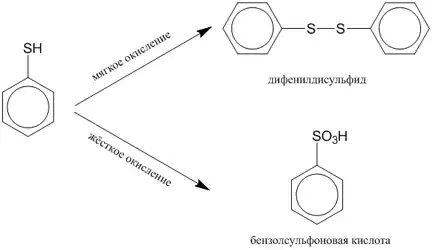 Окисляется при действии слабых окислителей или в мягких условиях до дифенилдисульфида, при действии сильных окислителей — до бензолсульфокислоты.