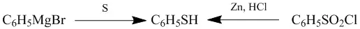 Синтез тиофенола осуществляется взаимодействием серы с фенилмагнийбромидом (реактив Гриньяра) или методом восстановления бензолсульфохлорида: