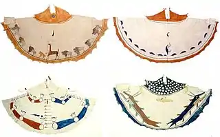 Красный цвет символизировал землю и огонь. Им могли изображаться горы, прерия, степной пожар и так далее. Жёлтый цвет — цвет камня, а также молнии, которая часто изображалась линией, идущей от вершины. Белый цвет помимо воздуха, пустого пространства, мог означать воду. Чёрный и синий — небо.